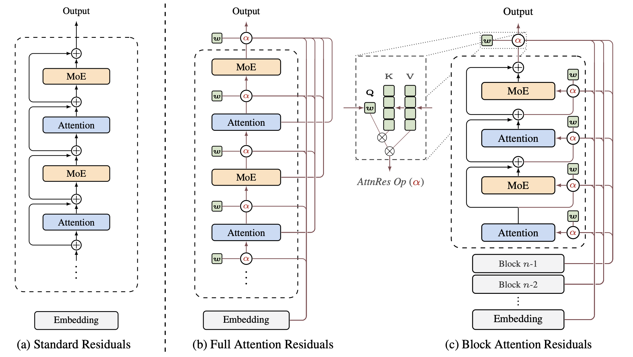 (a) Standard residuals with uniform additive accumulation. (b) Full AttnRes: each layer attends over all previous outputs. (c) Block AttnRes: layers are grouped into blocks, reducing memory from O(Ld) to O(Nd).
