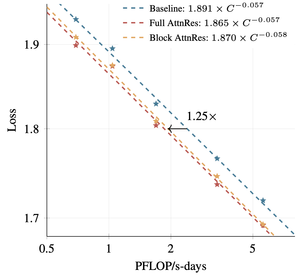 AttnRes consistently outperforms the baseline across all compute budgets. Block AttnRes matches the loss of a baseline trained with 1.25x more compute.