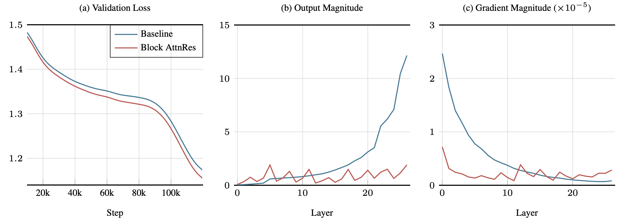 AttnRes mitigates PreNorm dilution: output magnitudes remain bounded across depth and gradient norms distribute more uniformly across layers.